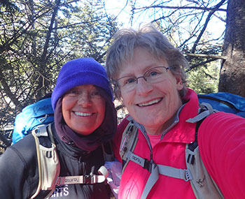 I feel very strong when we start out. Good energy, strong legs, and a pace slow enough to keep my asthma under control. We soon arrive on the ridge and take the Joe Quarry Trail. I simply love ridge trails and am deep in a state of happiness just looking around me. All the snow and ice has melted off the steep ledges. We step lightly up and down the hills and almost walk by the East Quarry summit sign as it was just tacked to a tree standing on a small boulder next to the trail. Luckily, Nancy saw it and we stop to take some pictures.