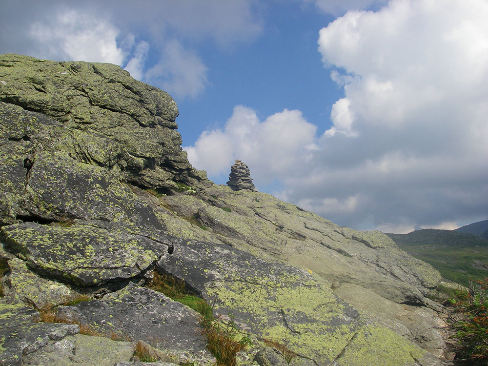 Onward and upward — I begin to suffer cramps again and have to find a spot above tree line to relieve myself. Very very nasty, but I feel more relief so we go on. At some point we decide we are going to go down via the Caps Ridge Trail and beg a ride back to the Castle trailhead — I can’t go back down the Castles and I am almost out of gas, struggling to make my legs work and to put my feet in the right places. No balance, no confidence, I feel miserable. We meet ZMan and 1HappyHiker again and explain our predicament — they offer to give us a ride if they can and our arrivals at the Caps Ridge trailhead coincide.
