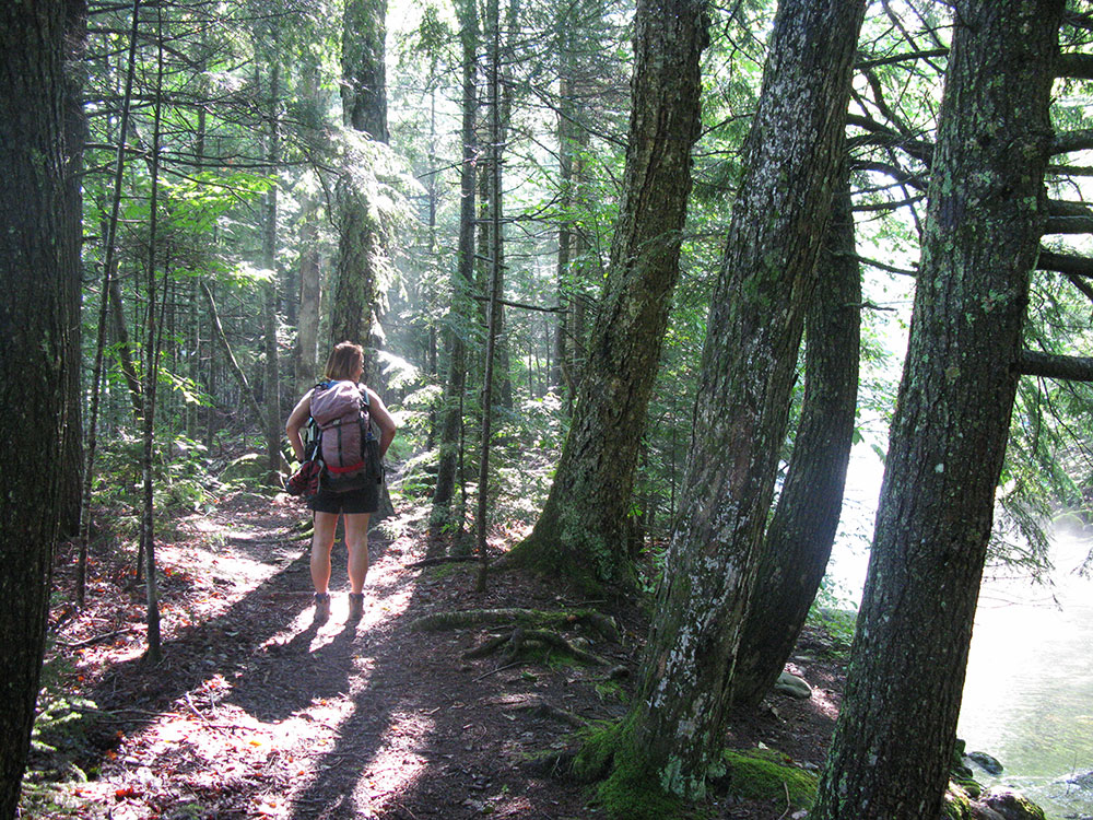 After a delicious breakfast at the Tilton Diner we head for the Mountain Bean for sandwiches and then to the trailhead. The trail starts off completely flat for about .4 of a mile — then we hit the Israel River, change into water shoes (I forgot mine and forgot about the water crossing so I borrow Nancy’s size 6 flip flops for my size 9 feet) and cross the river in no time. Even Pinta, my housemate’s nimble, athletic dog, decides she can cross the river without help. We leave our water shoes in the woods and start climbing. Half an hour later we are drenched in sweat — the humidity and the greasy rocks and roots make for a challenging climb. When we hit the steeper part of the ridge climb, we breathe heavily. I am struggling with my breathing, having been diagnosed with a mild case of exercise induced asthma, and it’s still not yet part of my routine to bring my inhaler when I hike.