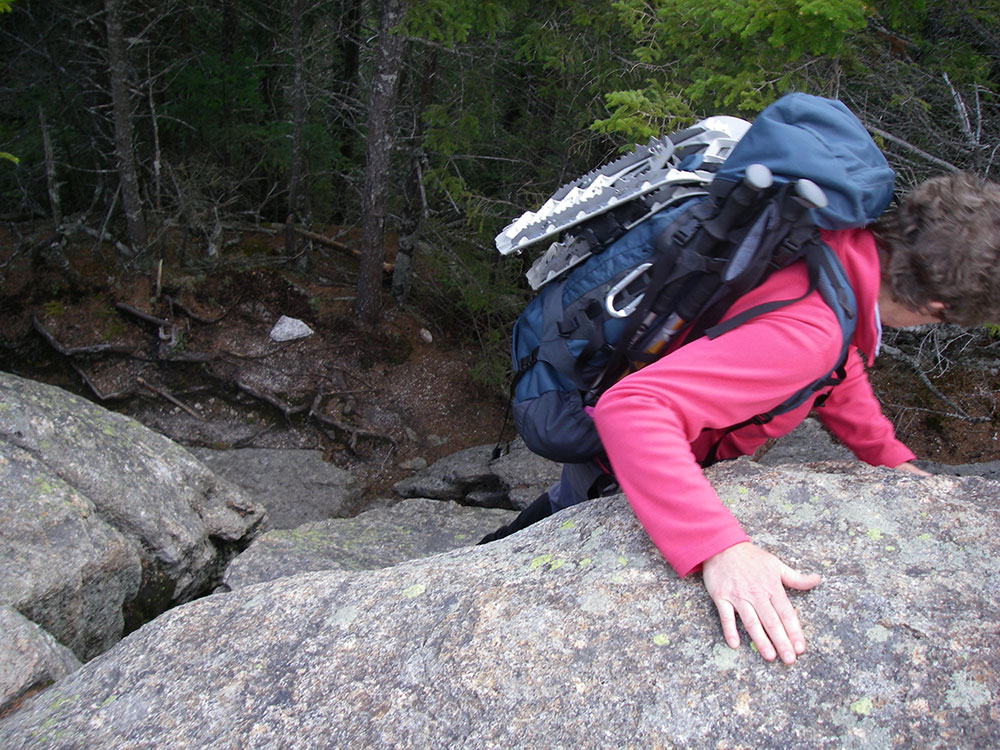 This time we put our snowshoes on and just walk across whatever happens to be under our feet — snow, branches, mud, river, rocks, dry trail – we just keep walking. We meet a few guys who are eyeing our snowshoes with envy, but we’re on a mission to get back and don’t let in how smart we are. With big relief we arrive back on Whiteface and head down the ledges without resting. I am nervous about going down, but it turns out it is much easier than going up. I just sit down and slide on my butt.