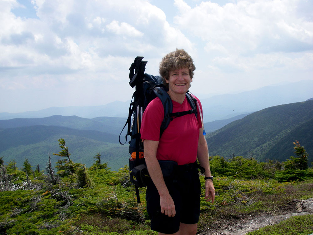 Soon we hit ladders and steps that take us up the steepest pitches of the trail, and then we run into a boardwalk that leads the way up the final stretches to the summit of East Goose Eye. Much of the time that I am on the ladders and the boardwalk, I am marveling at the fact that I am walking on something man-made, 3,000 feet up in the middle of nowhere! From the internet I discovered the Wright Trail was constructed by the state of Maine in the 1990s. I often take for granted what is under my feet. I forget that it took lots of people months, muscles, money and mental muster to make this trail for me – from the idea, to the plan, the mapping and design, and hard physical labor. I get the joy of being able to put one foot in front of the other without tripping (most of the time), and without getting lost (most of the time), leaving me at peace to enjoy all that is around me.