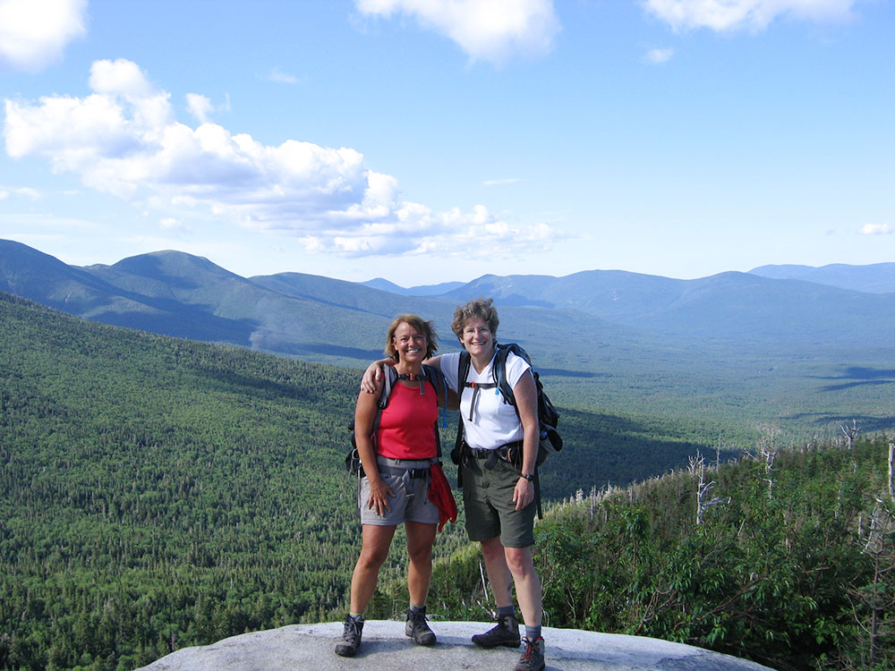We have lunch close to the summit. Pat surprises me with a cold Snapple she lugged up in a cooler in her pack. She breaks out her cold Pepsi and we toast each other. Bliss! I take out two rocks I had collected from other hikes. I don’t know which 4,000-footers they came from, but it doesn’t matter. We place the rocks on the cairn closest to the summit, leaving symbols of our 48 4,000-footer journeys on the top.